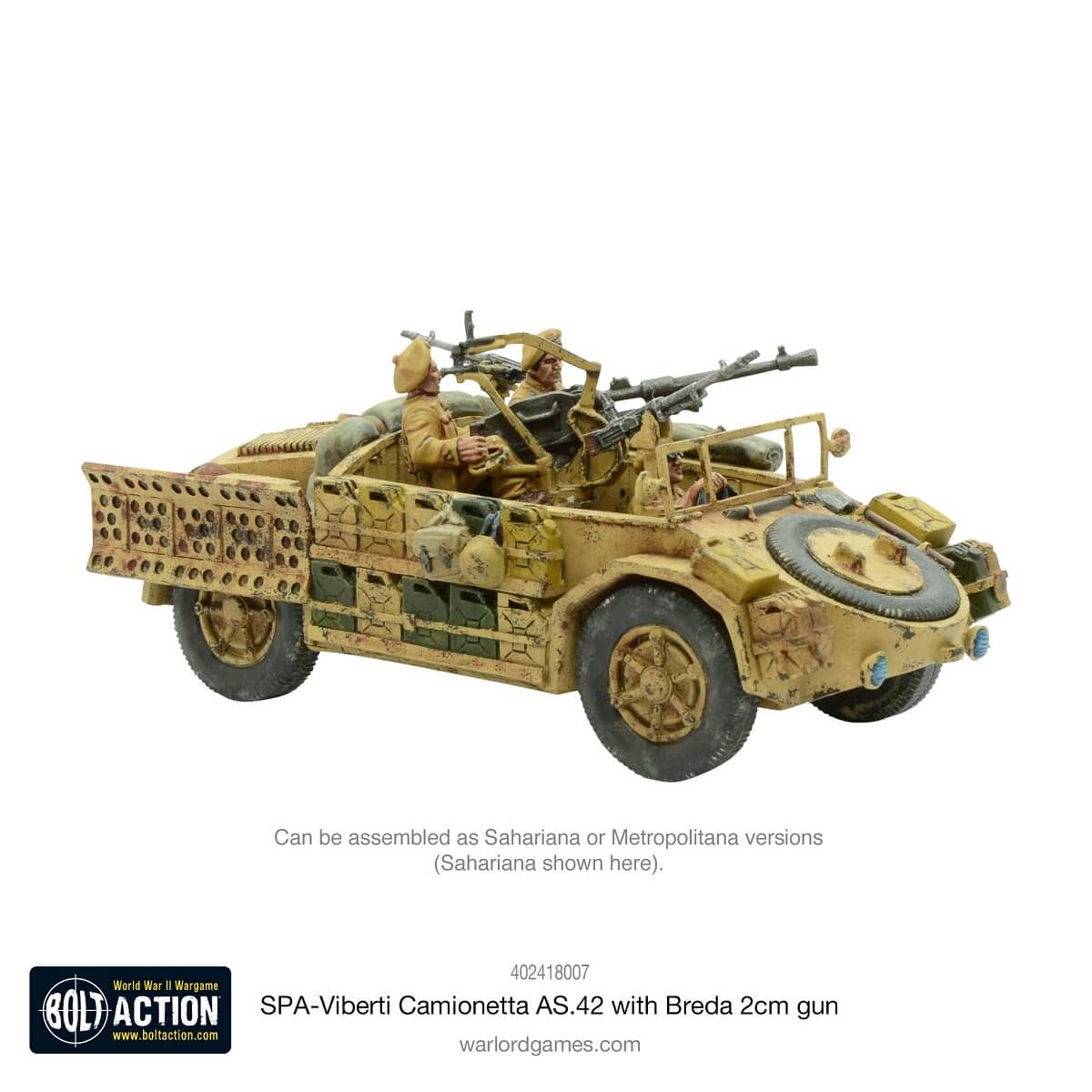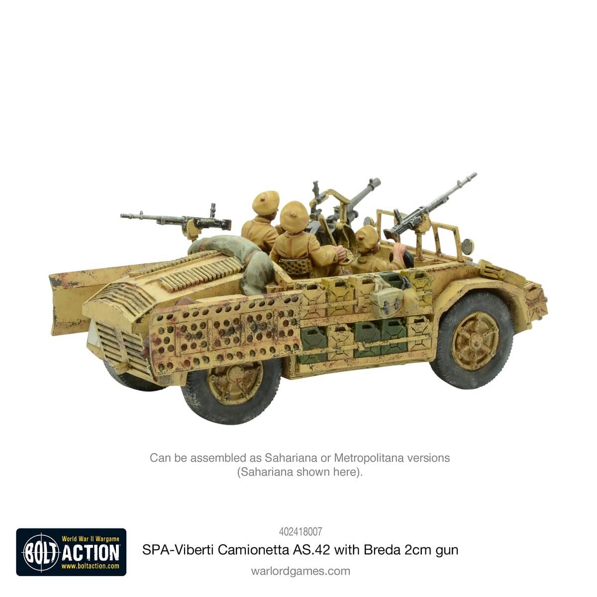 This vehicle is supplied with parts to make either a Sahariana or Metropolitana along with a pintle-mounted Breda 2cm automatic cannon, two medium machine guns and three Arditi crew figures.