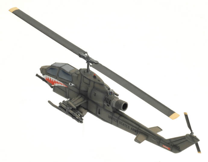 This Cobra is a tank hunter, relying on its narrow frontal profile, the long reach of the Improved TOW missile, and skilful flying to remain undetected as it hunts its prey. The Cobra’s chin-mounted M197 20mm Vulcan Gatling gun makes short work of infantry and lightly-armoured vehicles, and any enemy helicopters it may come across.