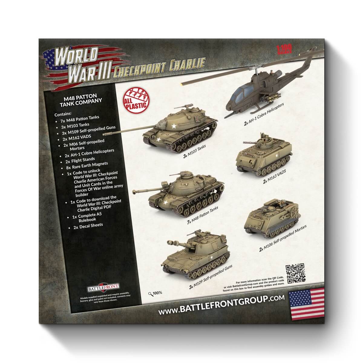 Jump straight into the Cold War gone HOT with this WWIII: Checkpoint Charlie American Starter Force. This Starter Force contains everything you need to begin collecting and playing an American Force in WWIII: Checkpoint Charlie, with a collection of highly detailed plastic models ranging from the heavy hitting M103 to the iconic predecessor of the M60 Patton, the M48 Patton. Support your tanks with a variety of supporting options, such as the M106 Self-Propelled Mortar or blanket the field with M109 Self-Propelled Gun.