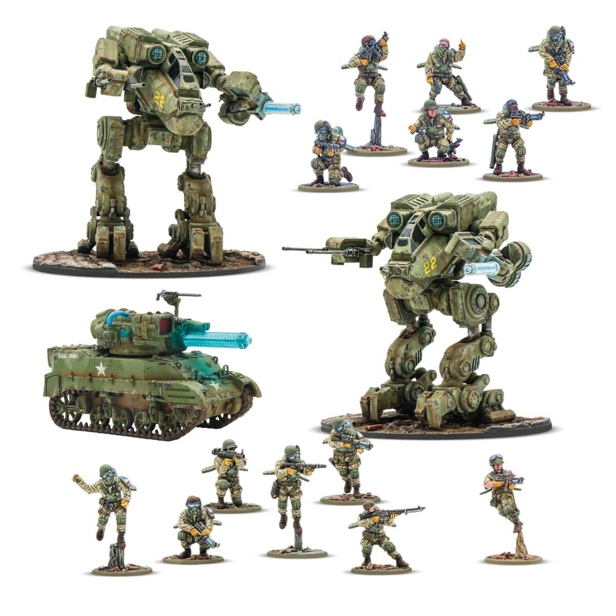 This fast-moving force is centred around an Assault Platoon, comprising two six-man Firefly squads. These ultra-mobile jump troops are capable of getting up close and personal with the enemy, delivering a short-range punch with their powerful weaponry, and getting out again, before they can be pinned down. Supporting them is the Armoured Platoon, with a pair of powerful M2A5 Linebacker walkers descending from the skies to bring a whole host of heavy firepower to bear where it’s needed most. On the ground, an M5 Stuart light tank mounts a crackling Light Tesla Cannon, sending devastating arcs of electrical energy crackling across the battlefield to fry infantry and vehicles with equal ease.