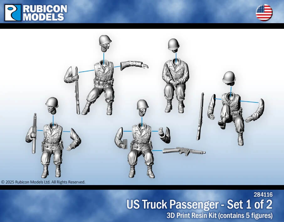 Set of 5 US infantry in seating pose. Designed for use with Rubicon Models CCKW-353 truck (280037), but can also be used with any US softskins.