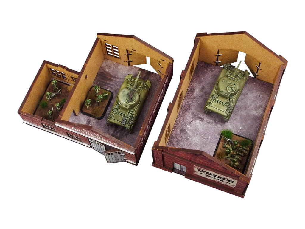 A set of two multicolor prepainted (UV-printed) WW2 Normandy buildings with accessible interiors and removable roofs. Multiple infantry squads and vehicles fits inside. Option to assemble with open/closed doors.