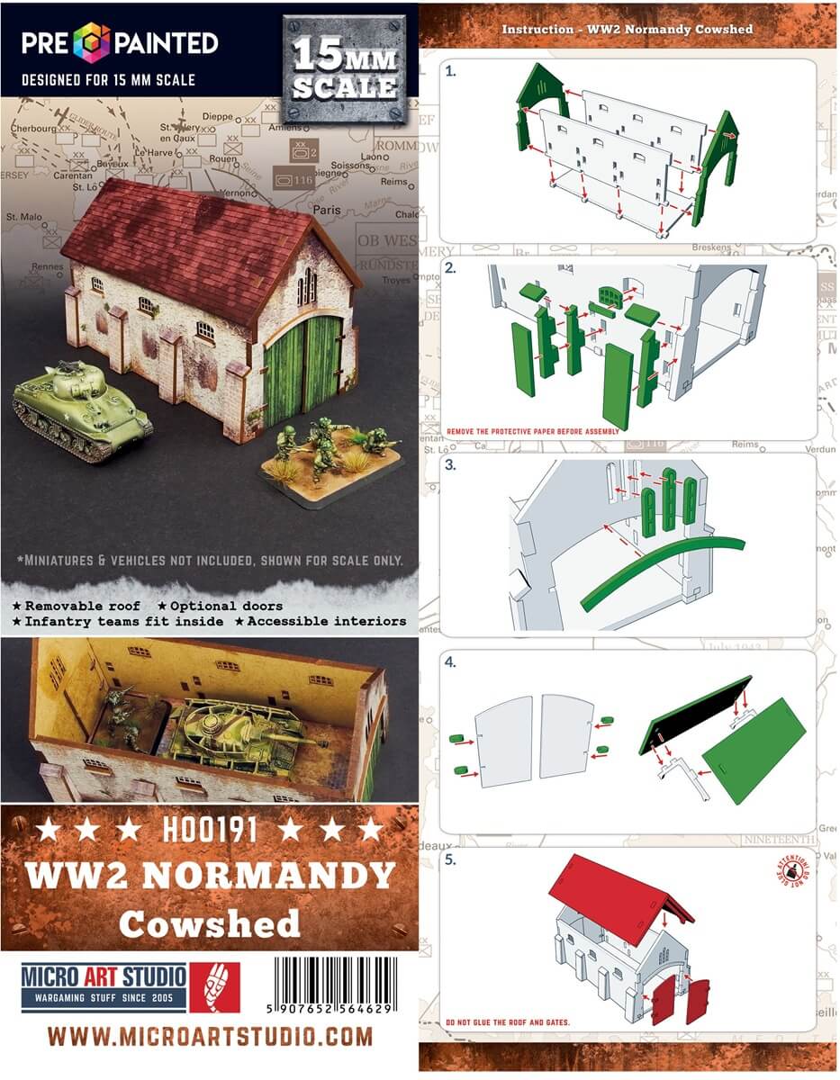 One multicolor prepainted (UV-printed) WW2 Normandy building with accessible interior and removable roof. Multiple infantry squads fits inside. Doors, windows and shutters included.