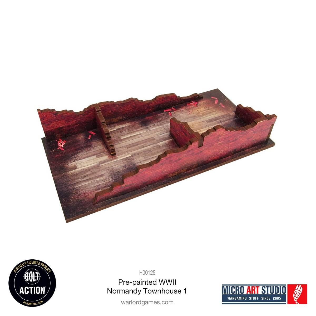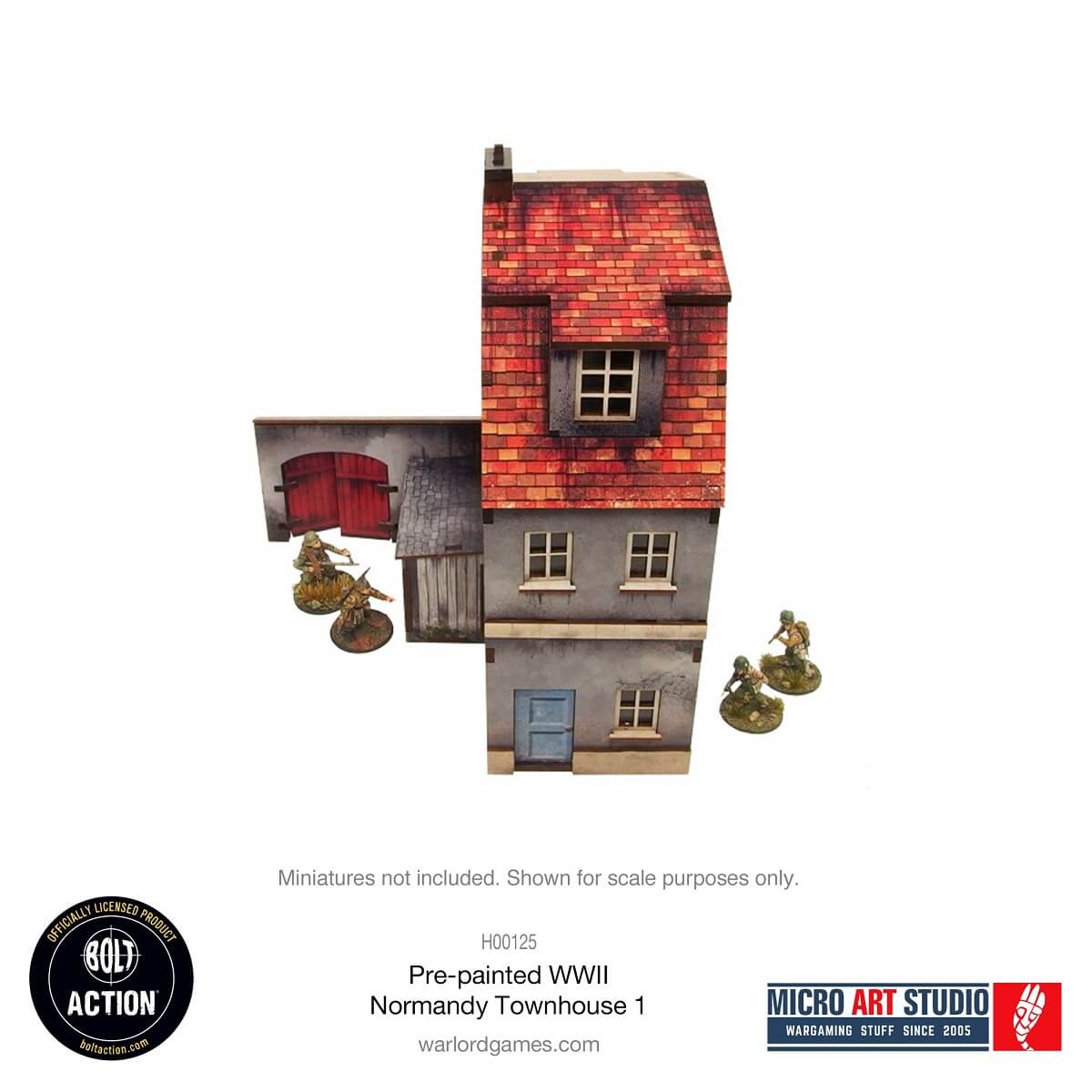 Multicolor prepainted (UV-printed) 3-level WW2 Normandy Townhouse 1 building with accessible colorful interiors, removable levels and removable ruined ground floor. Room to fit in the whole infantry squad inside. Pre-cut acrylic transparent window panes included. Option to assemble with open or closed doors. High wall with gate and shed included. The Gate can be opened or closed during play. Infantry full cover, vehicle hard cover, possible vehicle movement between buildings.
