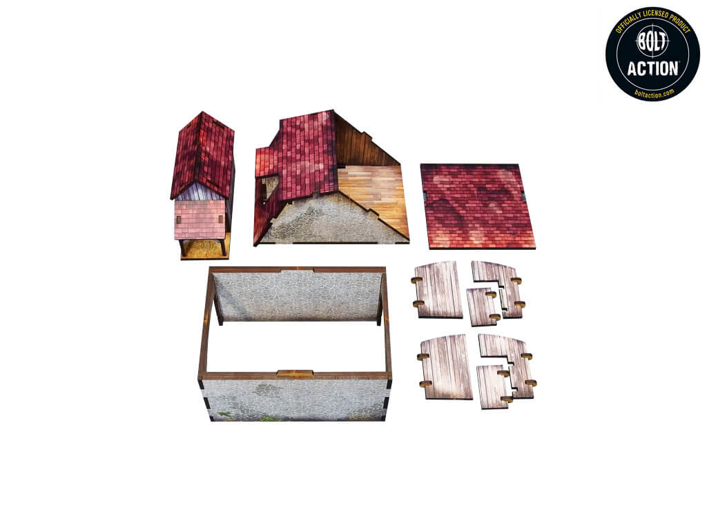 A set of 2 multicolor prepainted (UV-printed) WW2 Normandy Coach House w. Chicken Coop buildings with accessible interior and removable roof of the main building. Room to fit in the whole infantry squad or small vehicle inside. Pre-cut acrylic transparent window panes included. Option to assemble with open or closed doors.