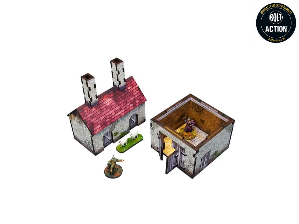 A set of 3 multicolor prepainted (UV-printed) WW2 Normandy Homestead buildings with accessible colorful interior, removable levels and removable ruined ground floor of the main building. Room to fit in the whole infantry squad inside. Pre-cut acrylic transparent window panes included. Option to assemble with open or closed shutters and doors.