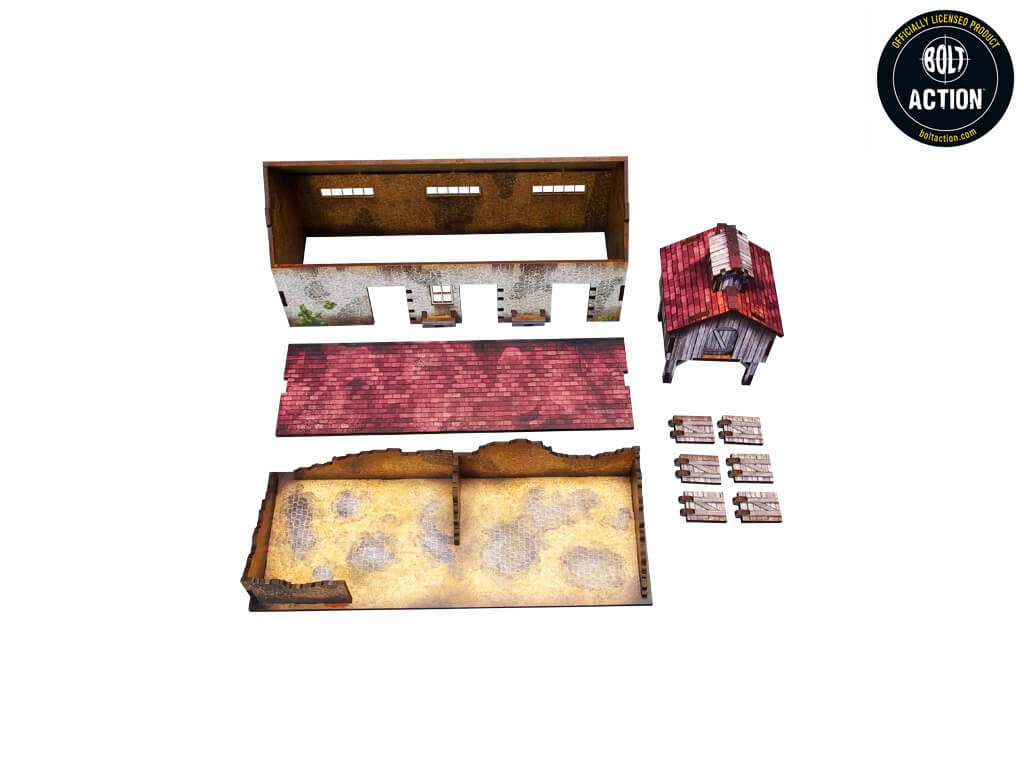 A set of 2 multicolor prepainted (UV-printed) WW2 Normandy Stable w. Dovecote buildings with accessible colorful interior, removable roof and ruined ground floor of the main building. Room to fit in the whole infantry squad inside. Pre-cut acrylic transparent window panes included. Option to assemble with open or closed doors.