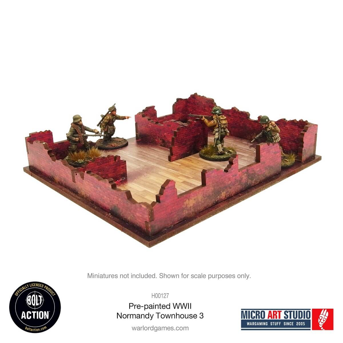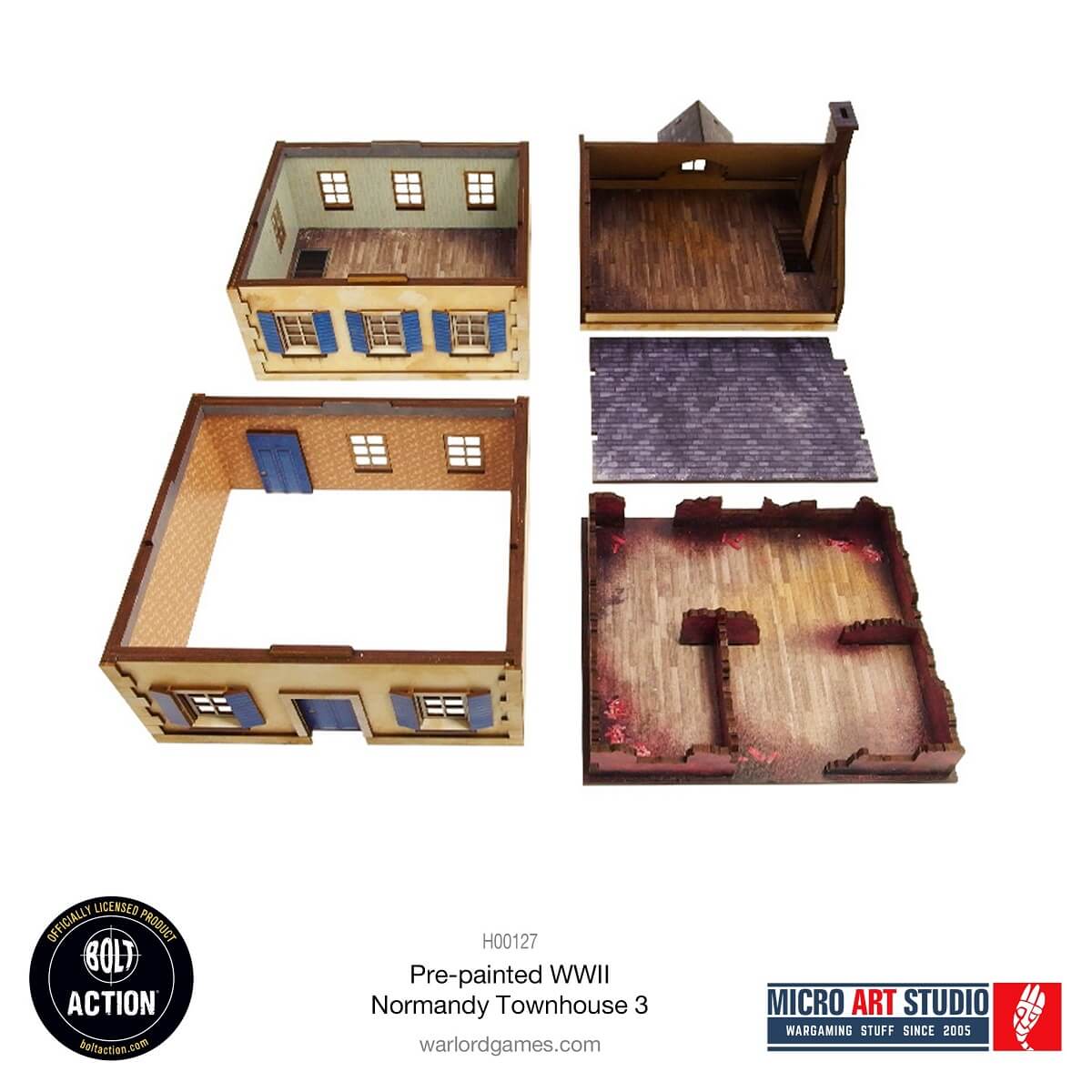 Multicolor prepainted (UV-printed) 3-level WW2 Normandy Townhouse 3 building with accessible colorful interiors, removable levels and removable ruined ground floor. Room to fit in the whole infantry squad inside. Pre-cut acrylic transparent window panes included. Option to assemble with open or closed shutters and doors.