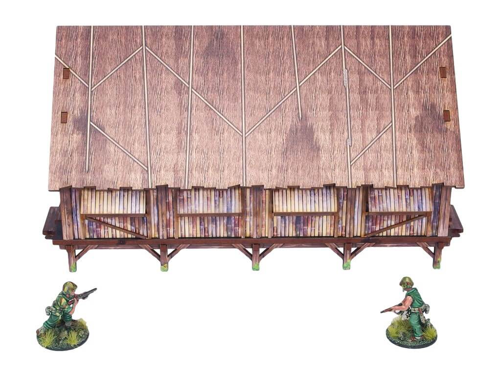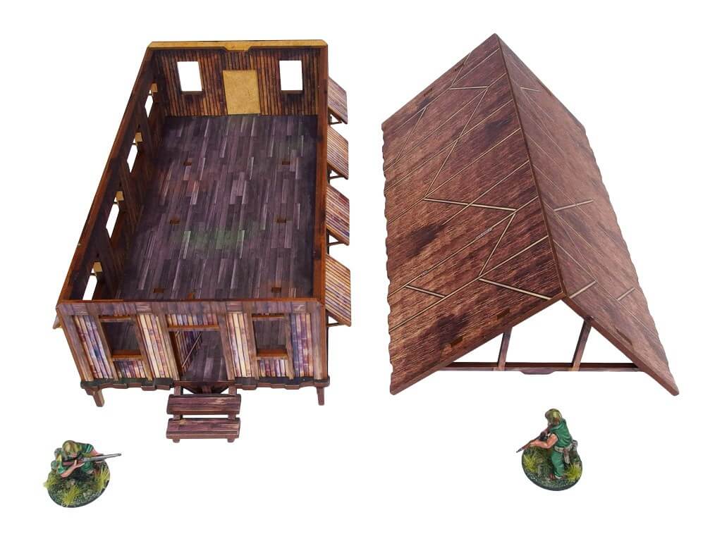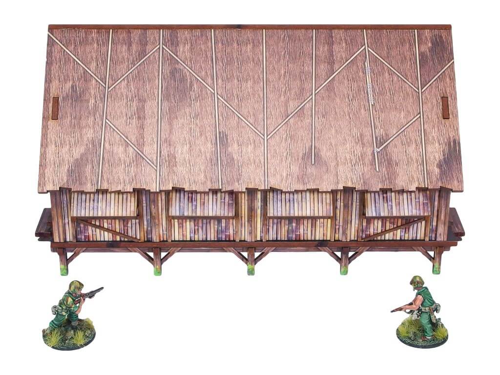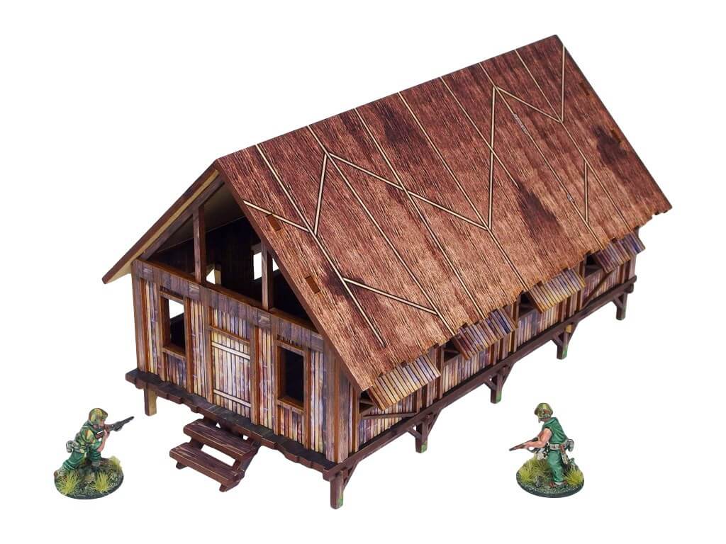Multicolor prepainted (UV-printed) WW2 Pacific Jungle Barracks (1) is a simple thatched roof building mounted on stilts, pefect to represent common South East Asia and Oceania architecture of 20th century.