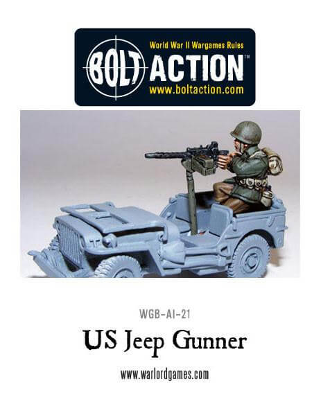 30 Cal machine gunner is shown here spraying lead at the enemy whilst his driver jinks the jeep around.